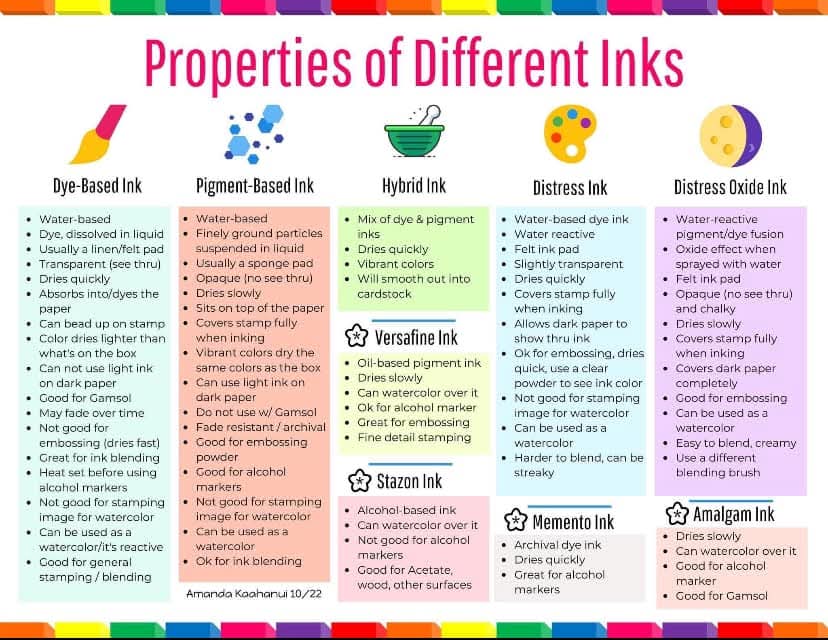 15. Inks – Get colors you like and types that work with the types of mediums you like to work with. You don’t need to buy every color that a company makes. I would buy a couple of dye inks and hybrid inks in colors that you like and test them out. I like Tim Holtz Distress Oxides Inks, Tim Holtz Distress Inks, Altenew Inks, Catherine Pooler Inks, Pinkfresh Inks, BetterPress Inks. You will need specific inks for different projects. Ex. You will need a permanent or archival type ink if you are going to watercolor a stamped image, and a water-based dye type ink when using alcohol ink markers. This chart was created by Amanda Kaahanui.